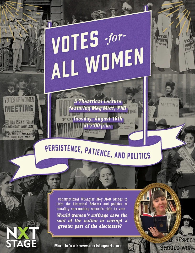 In recognition of the 100th anniversary of the ratification of the 19th Amendment to the US Constitution, Next Stage welcomes Dr. Meg Mott, Professor of Politics Emeritus of Marlboro College, for a theatrical lecture, online-only event examining the dreams and realities of women’s suffrage.